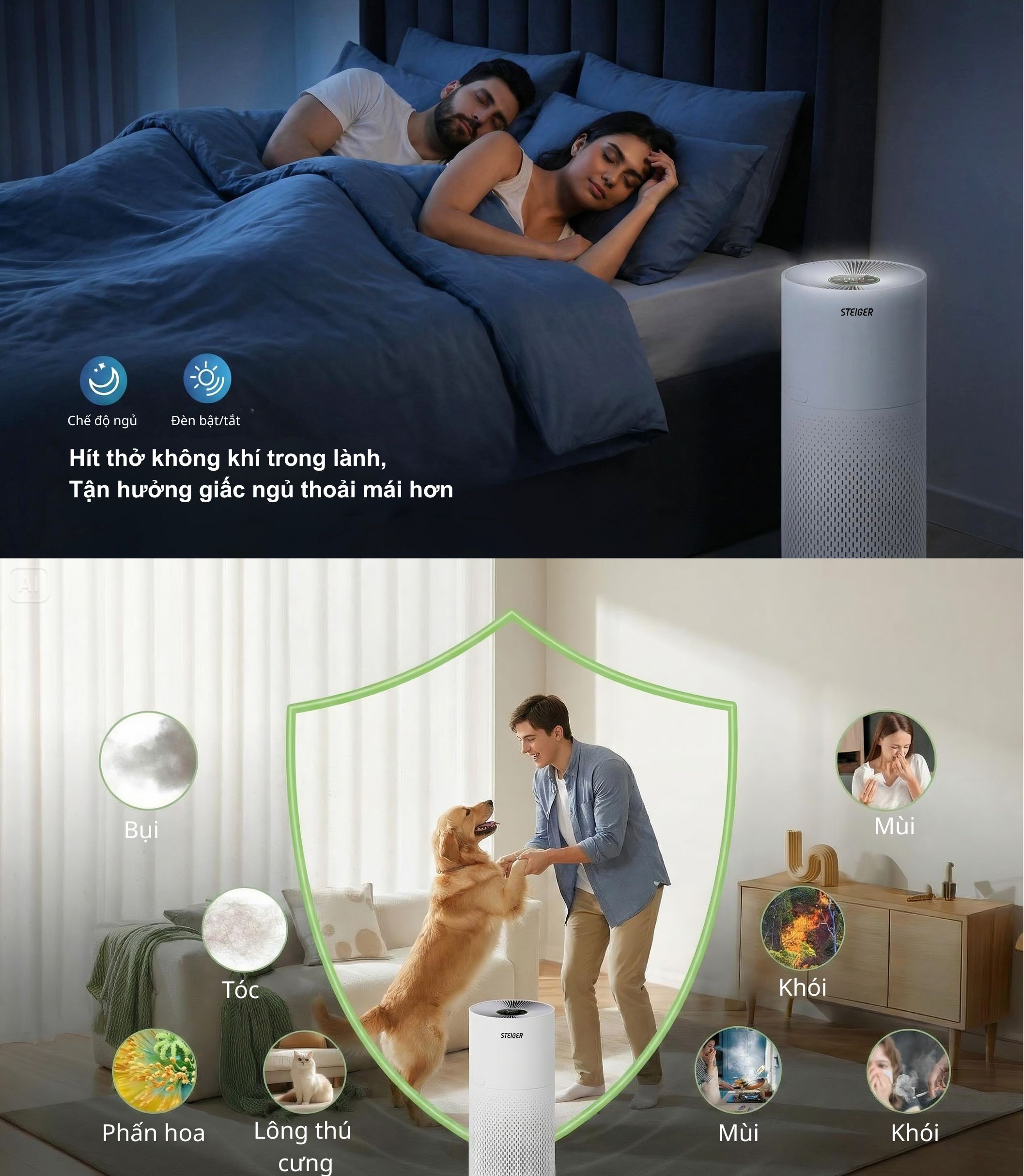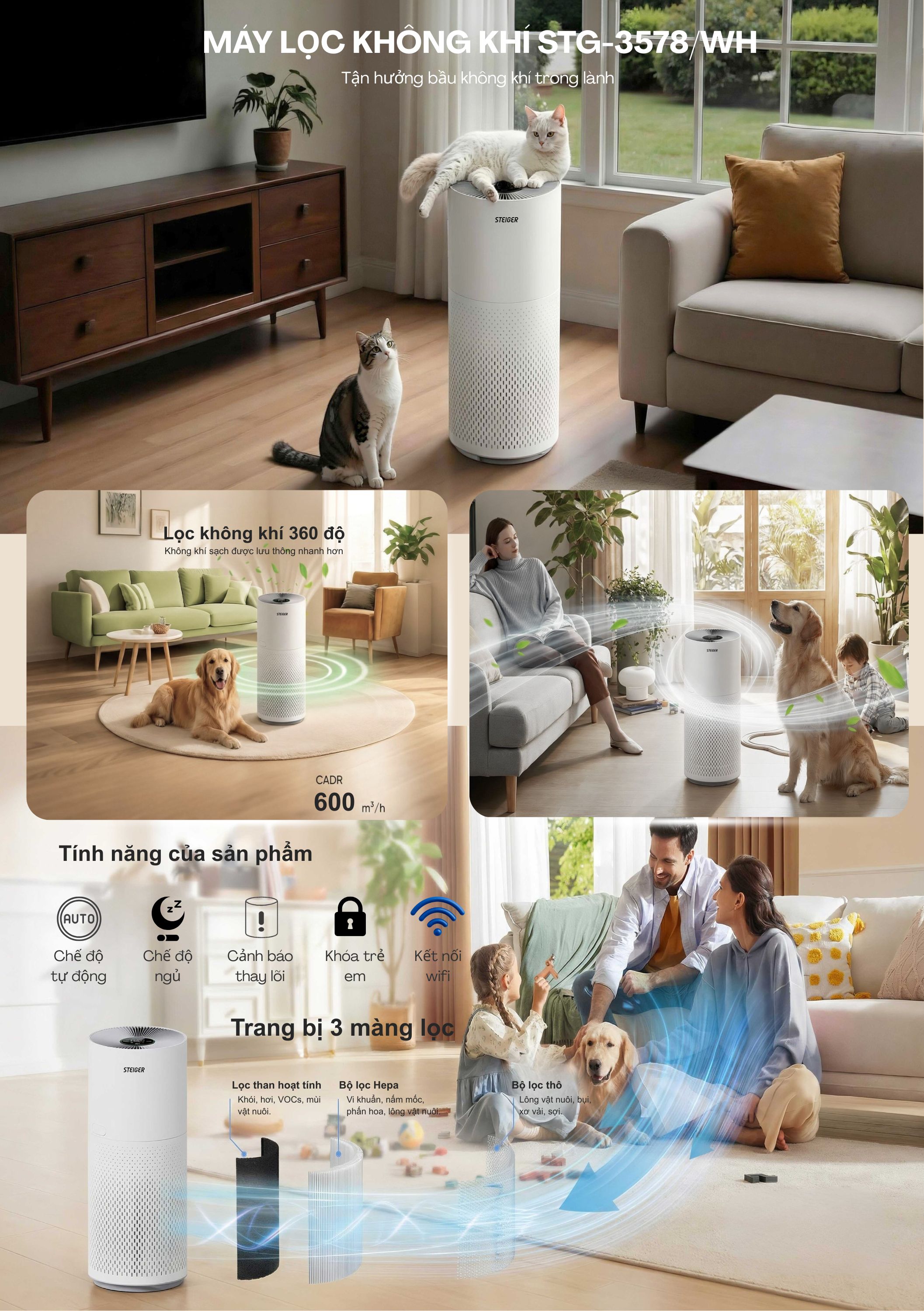 Máy lọc không khí Steiger STG là giải pháp hiệu quả giúp bảo vệ sức khỏe gia đình trước bụi mịn, vi khuẩn và mùi khó chịu trong không khí. Với hai phiên bản Steiger STG-3578/WH màu trắng và Steiger STG-3568/CH màu nâu, sản phẩm không chỉ mang lại hiệu quả lọc vượt trội mà còn hài hòa với nhiều phong cách nội thất.