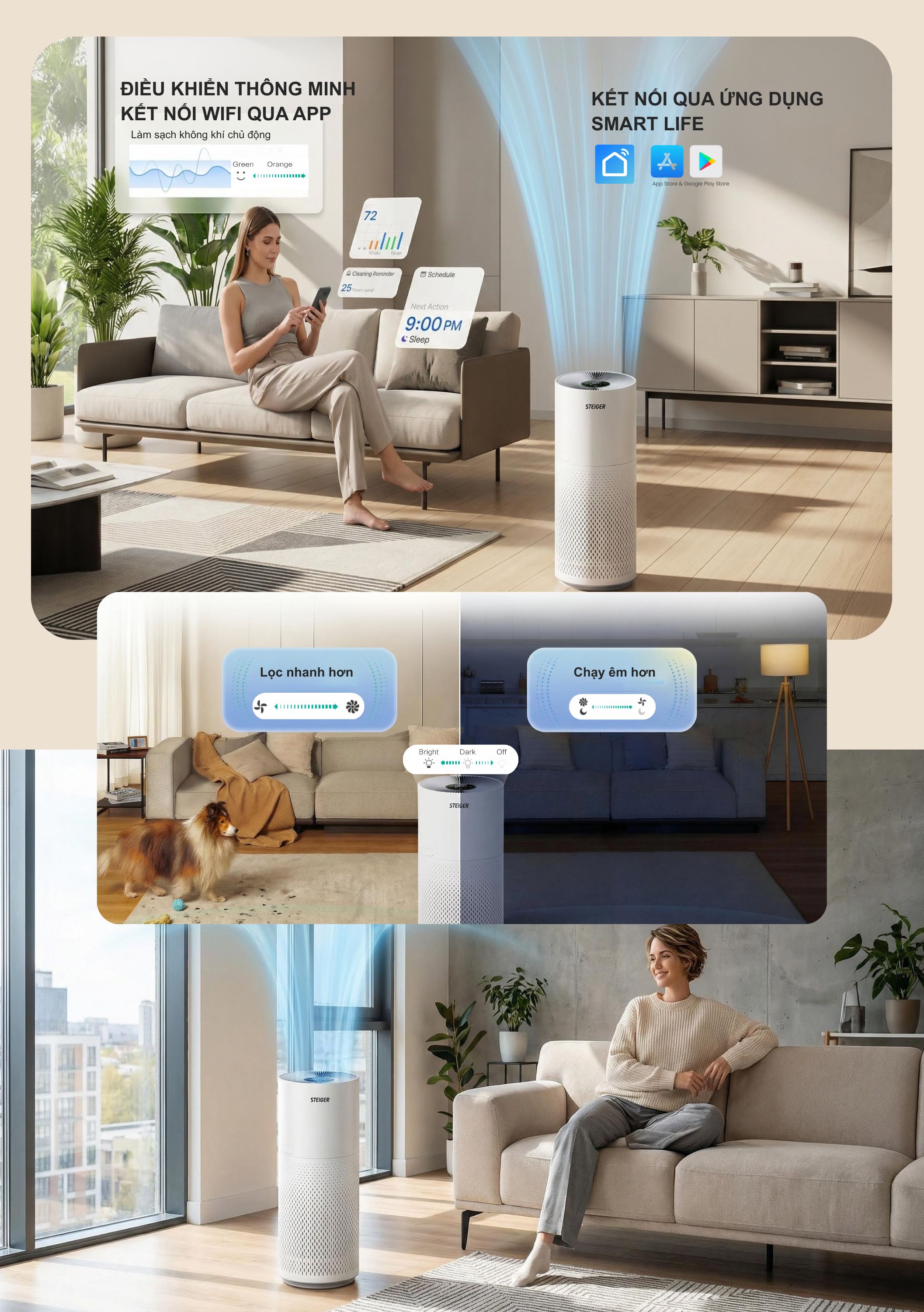 Steiger STG được thiết kế để đáp ứng nhu cầu lọc không khí cho không gian sống hiện đại, từ phòng khách, phòng ngủ đến văn phòng làm việc. Máy hoạt động mạnh mẽ nhưng vẫn êm ái, giúp duy trì bầu không khí trong lành và dễ chịu suốt cả ngày.