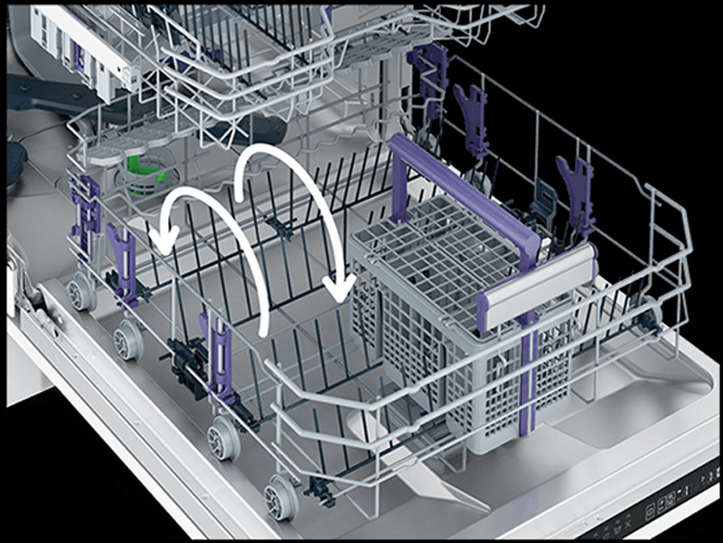 Hãy nói lời tạm biệt với tất cả những lần bạn không thể tìm ra cách cho những chiếc đĩa lớn hoặc ly dài vào máy rửa chén. Giờ đây với Hệ thống 3 vị trí Acrobat, bạn có thể điều chỉnh giá trên thành 3 vị trí khác nhau để tạo thêm không gian cho giá dưới để đặt những chiếc đĩa lớn.